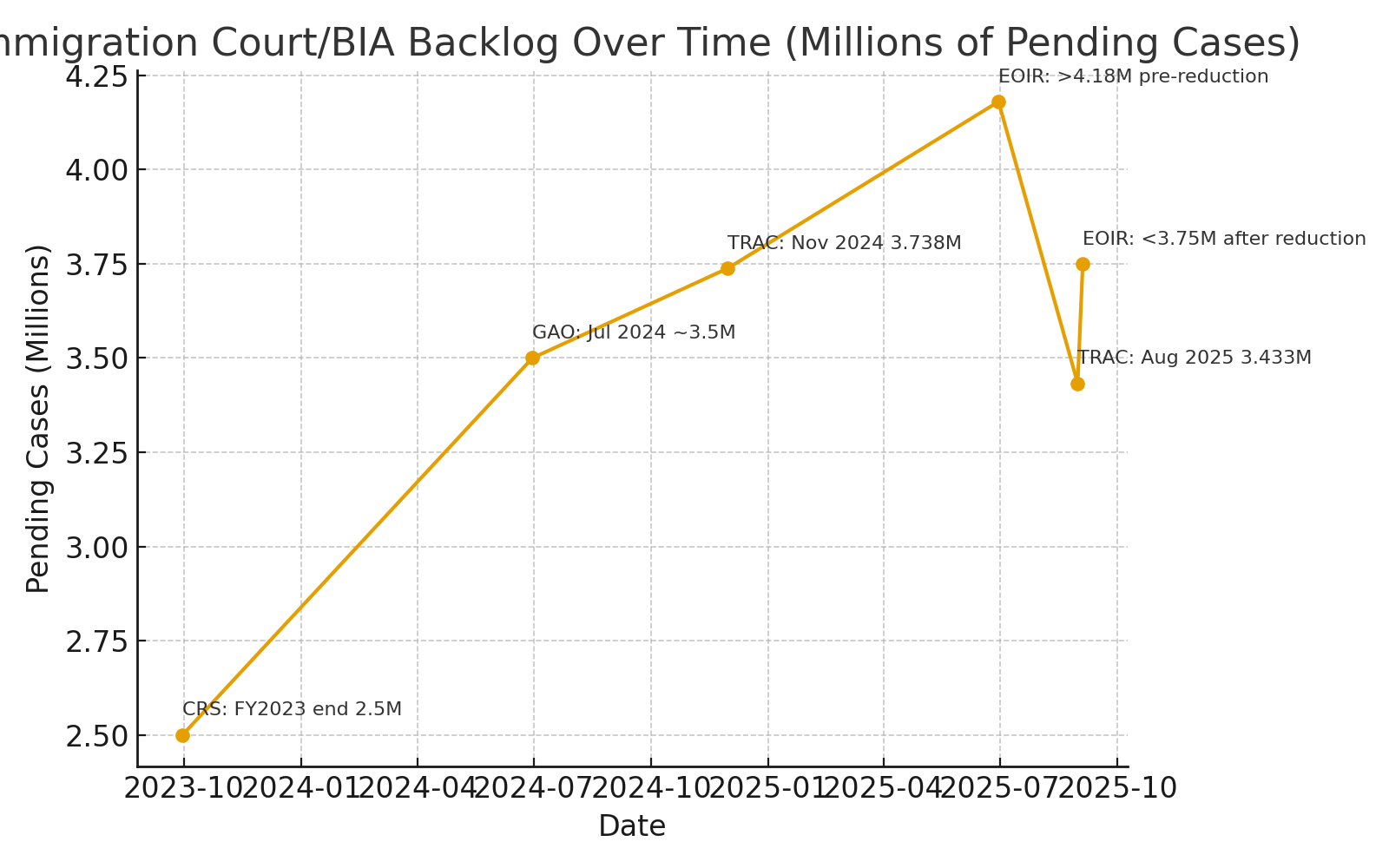 Independent trackers (using EOIR data) simultaneously recorded 3.43 million active cases at the end of August 2025, a lower figure that reflects definitional differences (e.g., how “active” vs. “pending” is counted). EOIR’s September 2025 milestone announcement placed the total under 3.75 million, describing the largest month-over-month backlog reduction in its history. Efforts to address the backlog have included proposals for more immigration judges and additional personnel, supported by increased funding and hiring initiatives.