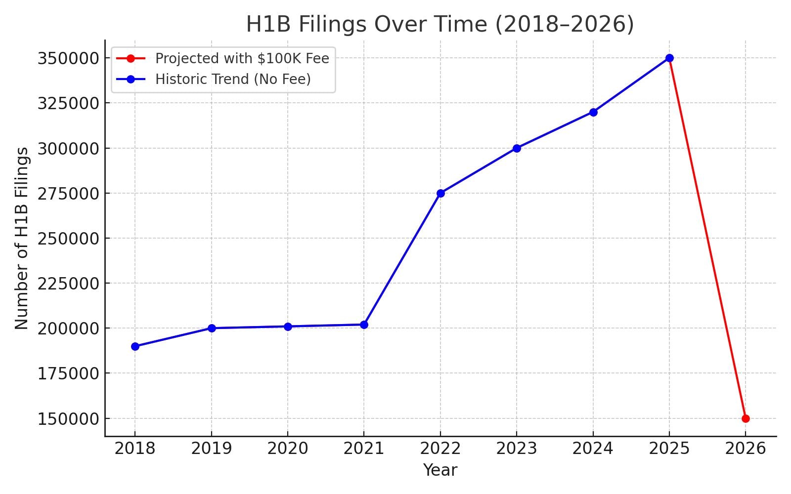 Line graph showing projected drop in filings after the $100K fee takes effect.