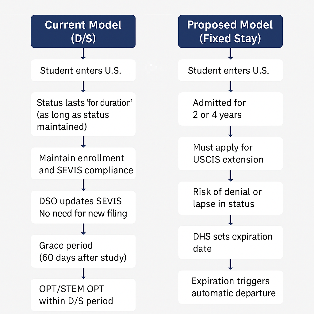 The DHS proposed rule for nonimmigrant students (F-1 and J-1) introduces a fixed period of stay, meaning international students and scholars would be admitted to the U.S. for a specific period (2 or 4 years) rather than the open-ended D/S model currently in use.