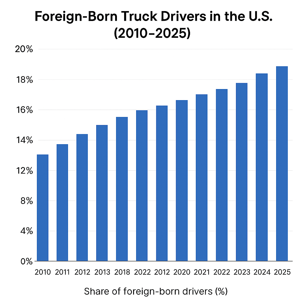 “Share of Foreign-Born Drivers in U.S. Trucking (2010–2025)” — showing steady growth from 11% to nearly 18%.